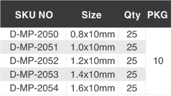 Taille : 0.8 10mm Qté (pièces par UV) : 25 |