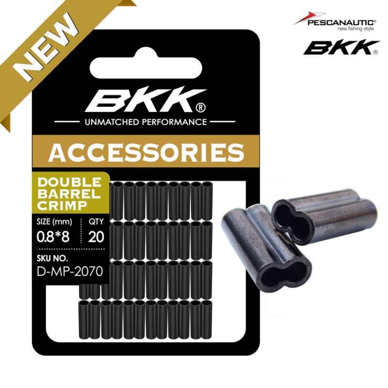 Les BKK Double Barrel Crimps sont des sleeves doubles en cuivre nickelé noir, solides et discrets, offrant des boucles lisses et sécurisées pour divers types de lignes et montages.