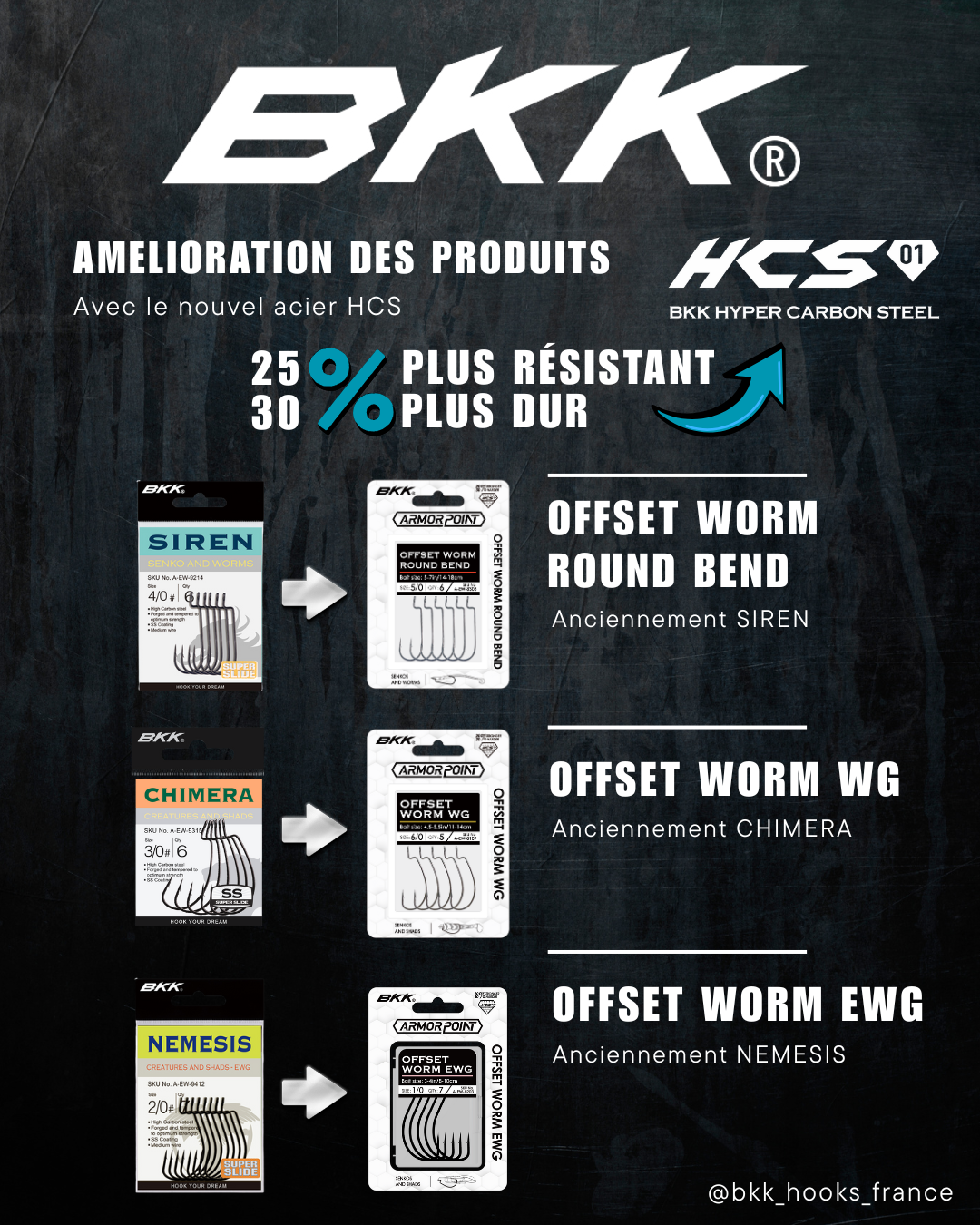 Les hameçons BKK évoluent ! Un nouvel acier a été mis au point par les ingénieurs de l'équipe BKK. Découvrez le HCS (Hyper Carbon Steel) sur toute la nouvelle gamme d'hameçons. A diamètre égal, cet acier a été testé et les résultats sont sans appels. La résistance a été améliorée de 25% et la dureté de 30%. Pêcher sereinement avec des hameçons fins tout en réduisant les risques d'ouverture et de casse.