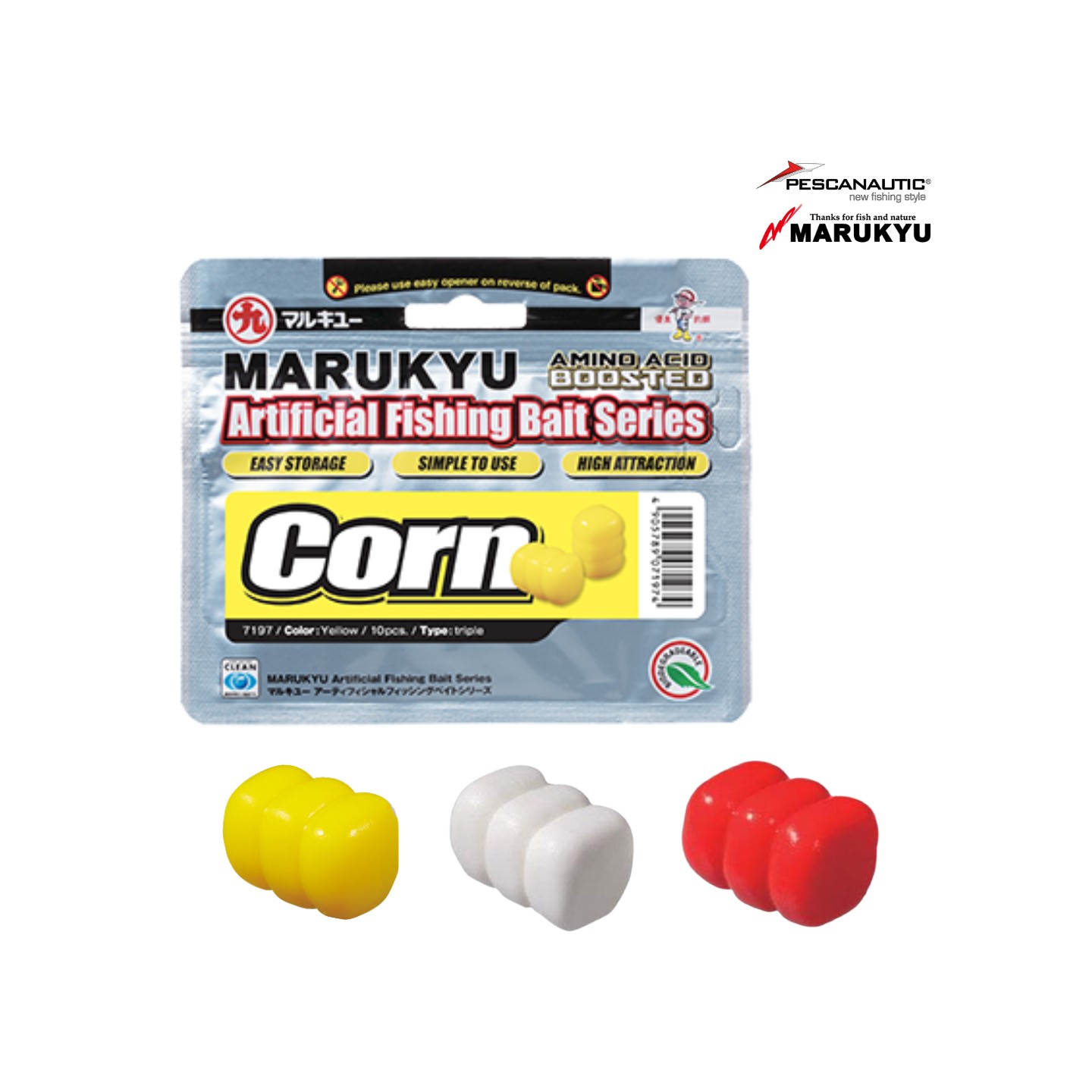 Le Marukyu Corn est une imitation parfaite d'un ou plusieurs grain de mais. Sa matière en polymère biodégradable est imprégnée d'acides aminés actifs qui diffusent rapidement ce qui met en activité les poissons dans la zone. Son efficacité est appréciée en plan d'eau sauvage et artificiel.