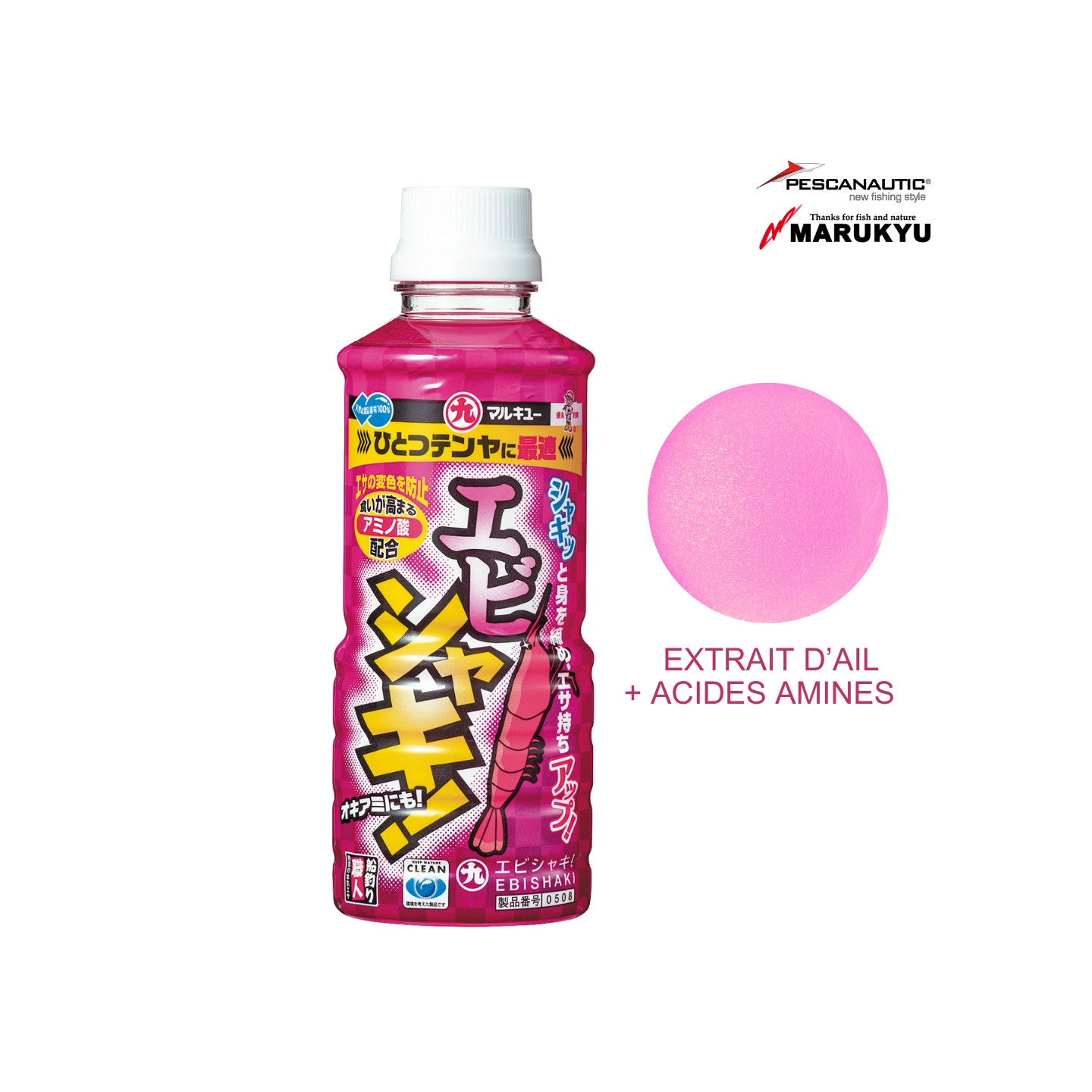 L'Ebishaki est un attractant liquide à base d'extrait d'ail et d'acides aminés particulièrement efficace et attractif. 100% d'origine naturelle et respectueux de l'environnement, l'attractant EBISHAKI a été développé au Japon par les scientifiques de l'équipe Marukyu dans le but de proposer un attractant efficace développé initialement pour les crevettes et gambas. Il trouvera donc sa place à bord pour les parties de pêche au Tenya mais également sur d'autres types d'appâts comme le calamar, les vers marins, coquillages et poissons.