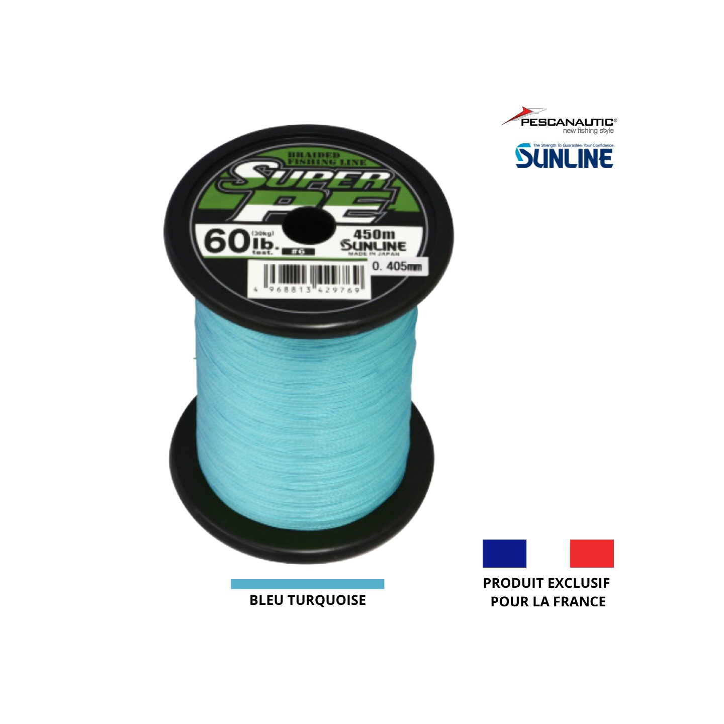 La tresse Sunline SUPER PE spécial chasse, de couleur bleu turquoise, est proposée en bobines de 450 mètres. Disponible en 40LB, 60LB et 80LB, elle offre une résistance exceptionnelle pour la pêche du thon rouge et des grands prédateurs. Produit exclusif disponible uniquement en France.