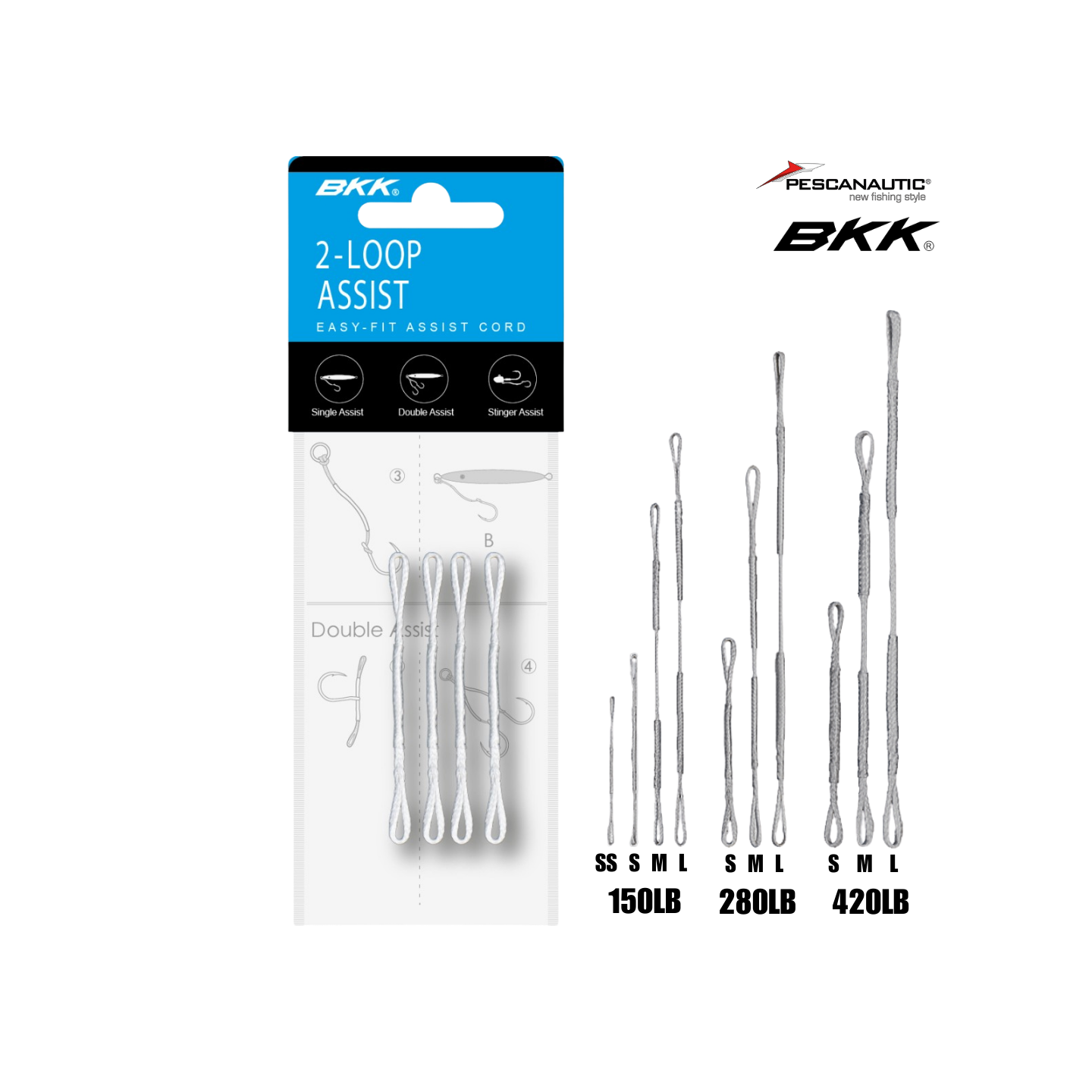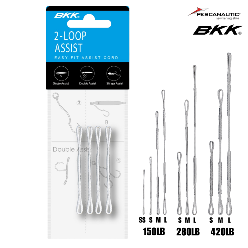 Le cordon Assist à 2 boucles BKK est une tresse d'assistance simple mais très pratique conçue pour attacher facilement vos hameçons de jigging à vos leurres. Il comporte deux boucles aux deux extrémités et un tube rétractable pour rigidifier la section médiane. Il existe en différentes longueurs pour s'adapter à la plupart des leurres, offrant différentes options de montage : les courts sont utilisés pour les montages à simple hameçon et les longs pour les montages à double hameçon. Certaines tailles peuvent être utilisées pour améliorer votre montage de tête plombée en connectant un seul hameçon ou un triple à l'œillet de la tête plombée (stinger).