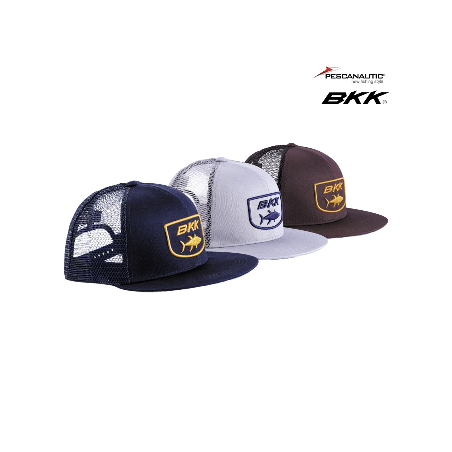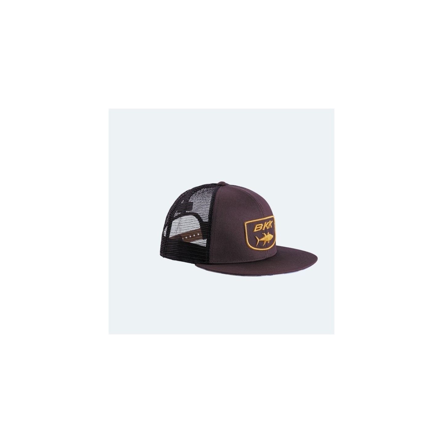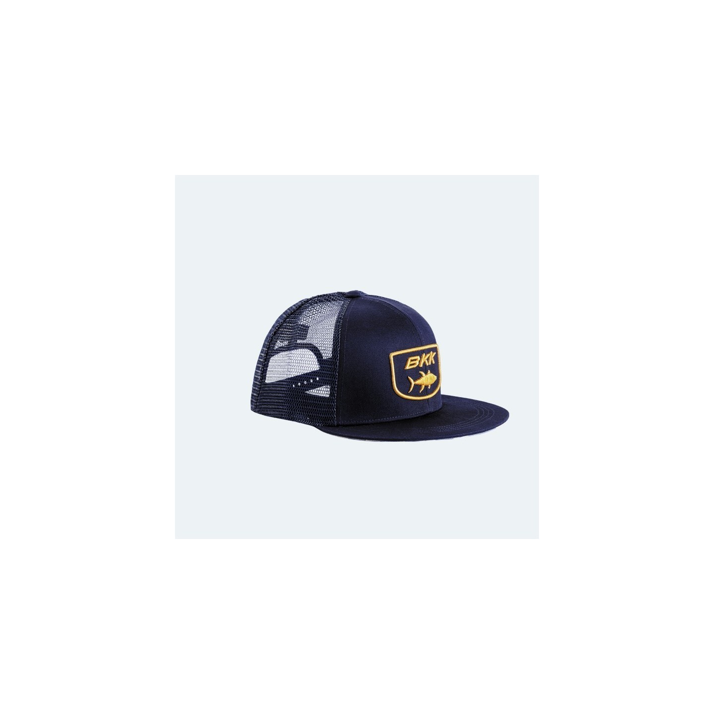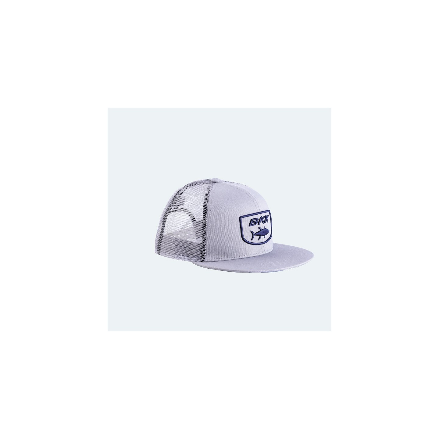 La BKK Tuna Snapback Hat est une casquette à visière plate ventilée et stylée, dédiée aux pêcheurs de thon, proposée en bleu, gris et marron.